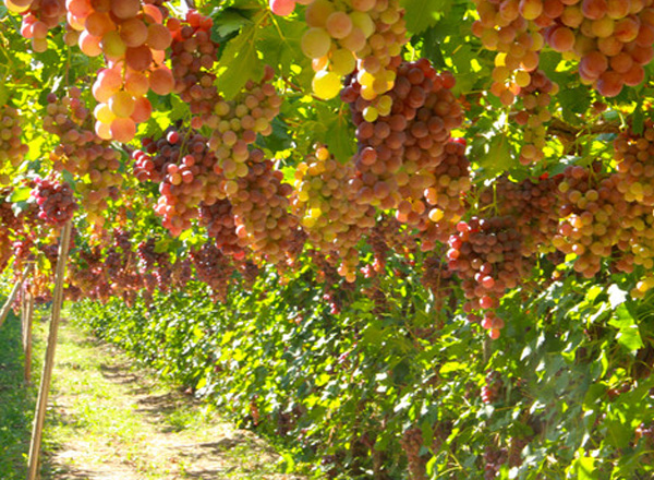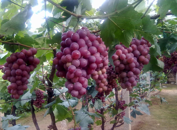 ? ? 紅提,又名晚紅、紅地球、紅提子,商品名稱紅提,屬歐亞種,是由美國加利福尼亞州立大學于70年代用(皇帝×L12-80)×S45-48雜交育成。果穗大,整齊度好,平均單粒重10 克,最大單粒重13克,紅色或紫紅色,果皮中厚,易剝離,肉質堅實而脆,細嫩多汁,硬度大,刀切而不流汁。香甜可口,風味獨特。7月下旬開始著色,9月下旬成熟。紅地球葡萄不易掉粒,耐貯運,冷藏可至2-3月,貨架期長。豐產性好,一般畝產1750-2000公斤,品質上等,市場競爭力強,是鮮食葡萄品種中最珍貴的和最具有商業價值的品種之一。
